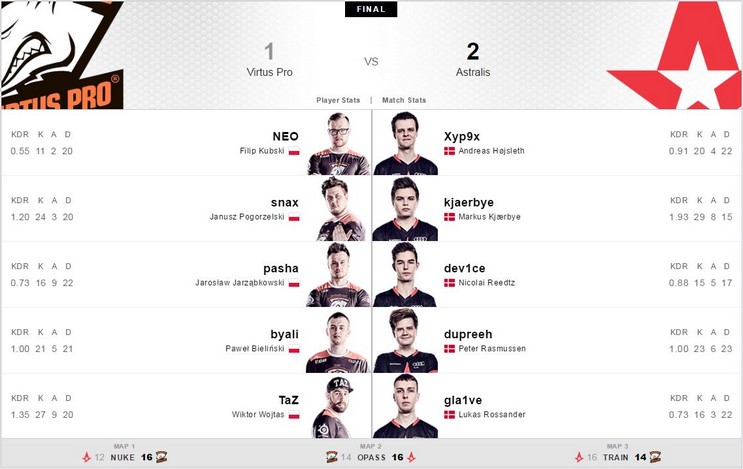 Après avoir éliminé Navi et les Fnatic, Astralis était opposé aux indéboulonnables Virtus.Pro lors de la grande finale du Major d’Atlanta (USA). Si le choc du week-end débuta mal pour les Danois, “Xyp9x” et les siens renversèrent la situation. En remportant les deux manches suivantes (14-16, 14-16), Astralis arrachait la victoire dans une finale digne de ce nom et qui aurait pu tomber d’un côté comme de l’autre (1-2).