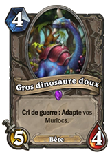 Gros dinosaure doux est une carte 5/4 coutant 4 cristaux de mana. Son cri de guerre permet aux joueurs d’utiliser la mécanique d’Adaptation sur les Murlocs. C’est une carte épique et neutre, elle coute 400 poussières et en vaut 100.