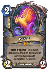 Pyros est une nouvelle carte de la famille des Elementaires avec un coût en mana de 2, deux points de vie et deux points d’attaque. Qui plus est, Râle d’agonie, la compétence de la carte, renvoie Pyros dans votre main et devient une carte 6/6 qui coûte 6 cristaux de mana. La carte est Légendaire et elle s’adresse aux Mages. Enfin, sa valeur en poussière est de 400 et son coût est de 1600.