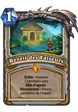 Réveil des Faiseurs est la première carte quête que nous connaissons. Coûtant 1 en mana, elle vous offrira Amara, la gardien de l’Espoir si vous invoquez 7 serviteurs avec Râle d’agonie. La carte est Légendaire et s’adresse aux Prêtres. Sa construction coûte 1600 poussières et elle en vaut 400.