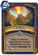 Volcan coute 5 cristaux et inflige 15 points de dégâts répartis de façon aléatoire entre tous les serviteurs. La carte est un sort rare et est pour les Chamans.