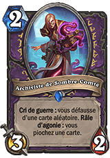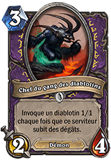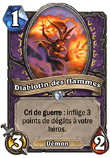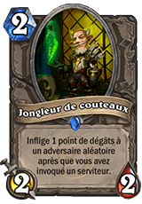 Le Diablotin de Malchezaar (x2) est une carte importante de ce deck. En effet en présence de ce démon sur le plateau, chaque fois que vous vous défaussez d’une carte, vous en piochez une nouvelle. L’Archiviste de Sombre-Comté (x2) vous fait perdre une carte lorsque vous le posez, mais vous permettra d’en piocher une nouvelle une fois éliminé. Le Jongleur de couteaux (x2) permettra à chaque invocation de serviteur d’infliger un point de dégât à un adversaire aléatoire ce qui vous permettra de tuer des serviteurs adverses plus facilement ou encore de les achever sur un coup de chance.