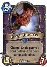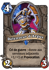 Enfin, Défenseur d’Argus (x2) permettra de gagner provocation et +1/+1 aux serviteurs adjacents, c’est donc un allié non négligeable tandis que Garde Funeste (x2) apporte une dose de testostérone au deck. En effet, c’est une charge 5/7 qui coûte 5 de mana. Seul bémol, il vous faudra vous défausser de deux cartes pour qu’il vous obéisse.