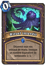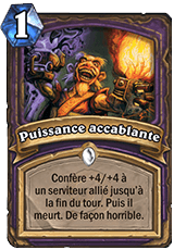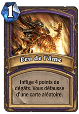 Les sorts sont au nombre de trois. Le Rituel Interdit (x1) invoque une carte 1/1 pour chaque cristal de mana utilisé ce qui se combine parfaitement avec le Jongleur de couteaux pour reprendre le contrôle du plateau en cas de pénurie de serviteurs. Feu de l’âme (x2) permettra d’envoyer 4 de dégât pour un seul cristal de mana. Le seul bémol est que l’utilisation de ce sort vous fera perdre une carte. Enfin Puissance accablante (x1) est une carte qui permettra d’améliorer un serviteur de +4/+4 afin de vous sortir d’une situation difficile comme une provocation avec beaucoup de vie par exemple.