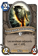 Les deux derniers serviteurs de ce début de partie sont le Loup alpha redoutable (x2) qui permet aux serviteurs adjacents de gagner +1 d’attaque. Ce loup donne de la force de frappe à vos créatures mais aussi un avantage non négligeable sur le plateau. Le Sinistre colporteur (x2) termine la liste et vous donnera le choix entre 3 cartes coûtant 1 en mana. Un Feu de l’âme pourquoi pas, ou encore en autre Diablotin de Malchezaar pour piocher davantage de cartes.