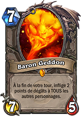 La fin de partie est le moment le plus intéressant. En effet, Ragnaros seigneur du feu (x1) permet de mettre une forte pression et sera difficile à gérer par votre adversaire qui aura surement déjà utilisé ses sorts pour gérer les géants arcaniques. Baron Geddon (x1) est présent de façon à gérer les deck Shaman et autres decks de type aggro. Ses dégâts de zone en plus d’être une 7/5 font de lui un serviteur redoutable. Malygos (x1) lui vous permettra de booster vos sorts de 5 dégâts.
