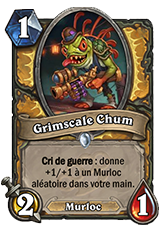 Grimscale Chum est un serviteur Paladin de la famille des Murlocs. Il s’agit d’un 2/1 pour 1 de mana qui possède un cri de guerre qui permet de donner +1/+1 à un Murloc aléatoire dans votre main.