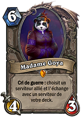 Madame Goya est une légendaire neutre. Ce serviteur 4/3 pour 6 de mana a un effet plutôt particulier. La pandarène vous propose en une fois posée sur le plateau de choisir un de vos serviteurs et de l’échanger avec un serviteur aléatoire de votre deck!
