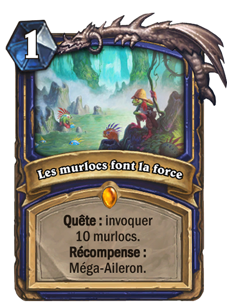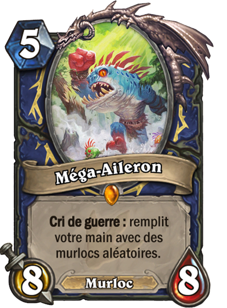 Unite the Murlocs est une quête pour le Chaman. Cette carte pour 1 de mana permet de gagner Megafin si vous invoquez 10 Murlocs. C’est donc Megafin cette troisième carte qui est la récompense de la quête légendaire. Il s’adit d’un Murloc légendaire 8/8 pour 5 de Mana qui remplit votre main de Murlocs aléatoires.