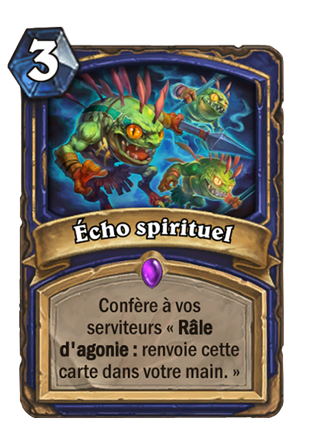 Écho spirituel est un sort Chaman qui pour 3 de mana confère à tous vos serviteurs un Râle d’agonie qui les renvoie dans votre main.