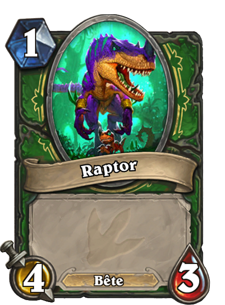 Petit raptor est une bête 2/1 pour 1 cristal de mana du Chasseur. Il place un raptor 4/3 dans votre deck, avec son Râle d’agonie.