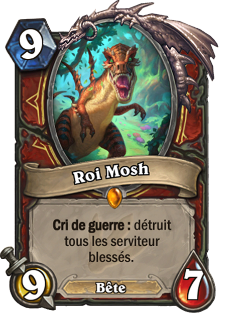 Roi Mosh est une bête légendaire 9/7 pour le Guerrier qui coûte 9 cristaux de mana. Cette carte permet grâce à son Cri de guerre de détruire tous les serviteurs blessés.