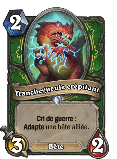 Tranchegueule crépitant est une bête 3/2 pour 2 de mana qui a la particularité de permettre à un serviteur allié de bénéficier d’une Adaptation lorsqu’elle arrive en jeu.